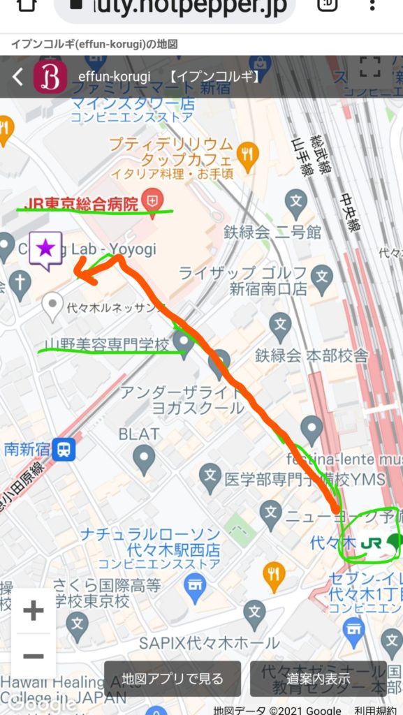 山手線の代々木駅西口を出て、駅の正面から横断歩道を渡り、ファミリーマートの右の方に行きます。カラオケ広場とドトールの間の斜めの道を2分位まっすぐ進みます。小田急線の踏切を渡ってまっすぐ進み、角の[皿うどん利代]さんを左に曲がり、向かって右側の3 番目の茶色の建物です。バロール代々木318 号が当サロンです。(エレベーター降りて左ですぐです)